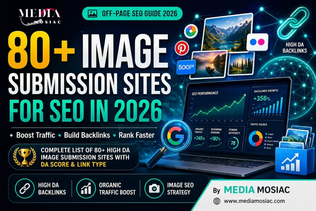 Most SEO practitioners focus only on text-based content, completely ignoring a massive opportunity: image submission for off-page SEO. By strategically sharing your images on high-authority platforms, you earn quality backlinks, improve Google Image Search rankings, and drive consistent referral traffic — all without spending a rupee on ads. In this guide, Media Mosiac shares the most comprehensive and updated list of image submission sites for 2026, along with a step-by-step submission process, image optimization tips, and common mistakes to avoid.